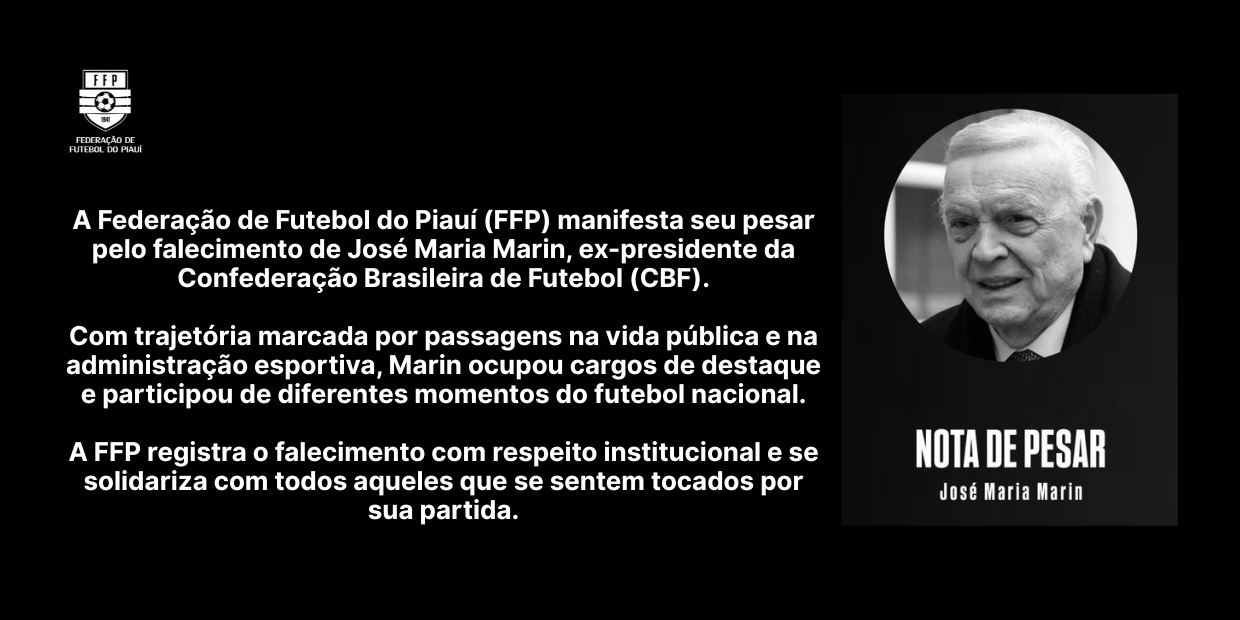A Federação de Futebol do Piauí (FFP) manifesta seu pesar pelo falecimento de José Maria Marin, ex-presidente da Confederação Brasileira de Futebol (CBF).