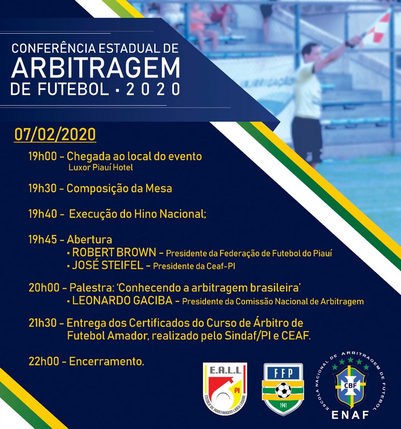 A conferência terá a participação do ex-árbitro Leonardo Gaciba, presidente da Comissão Nacional de Arbitragem da CBF. Gaciba foi árbitro do quadro da FIFA entre 2005 e 2009 e ia ministrar palestra com o tema “Conhecendo a arbitragem brasileira”. Também participam da conferência o presidente da FFP, Robert Brown Carcará e o presidente da CEAF-PI, José Steifel.
